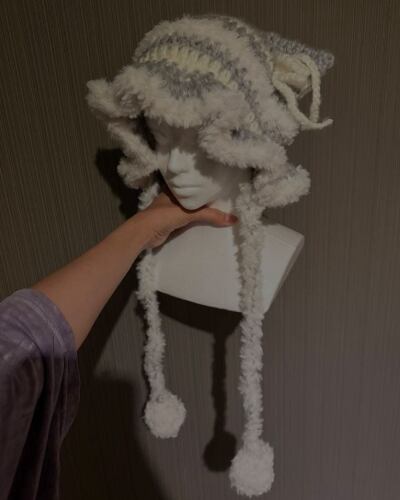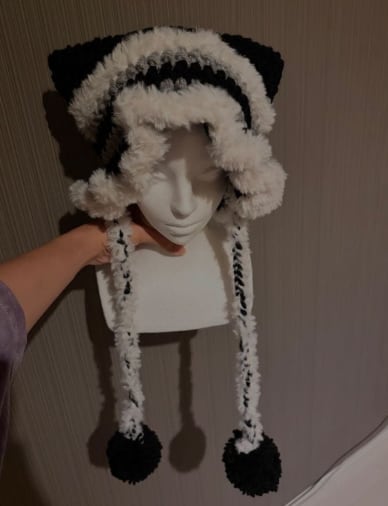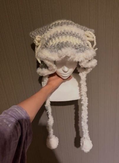 ねこみみとふりふりのデザインがポイントの手編みニット帽です。